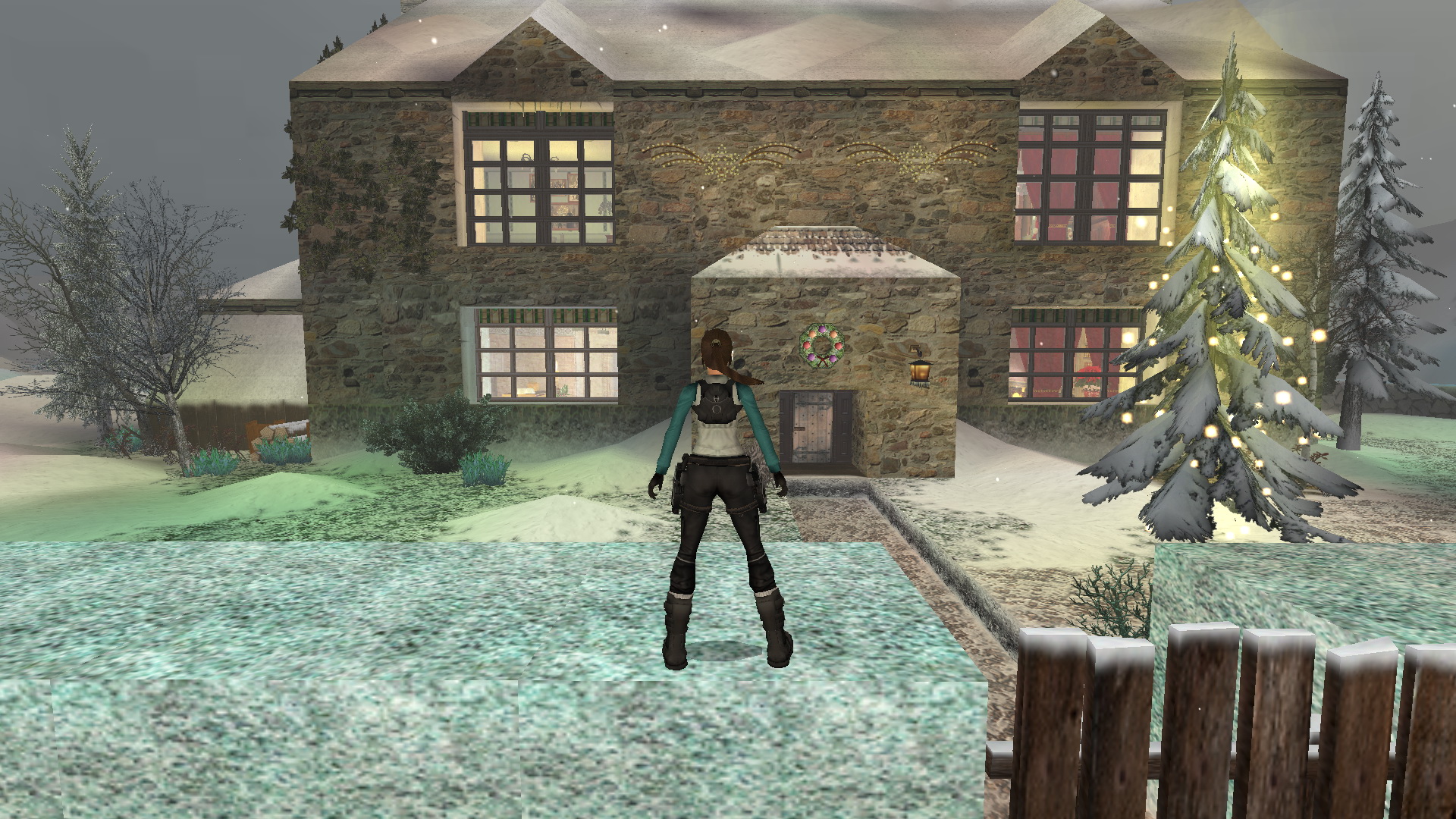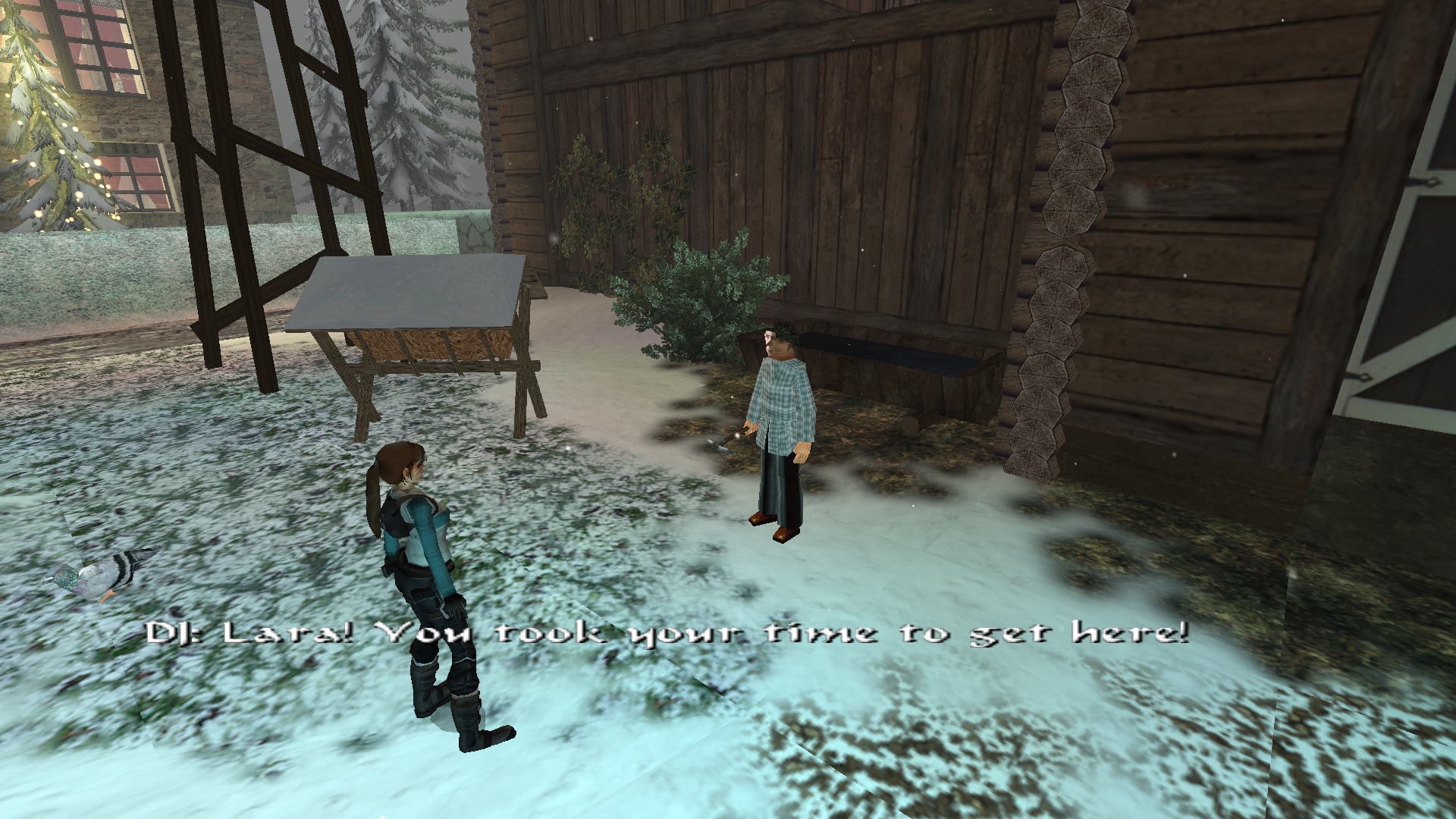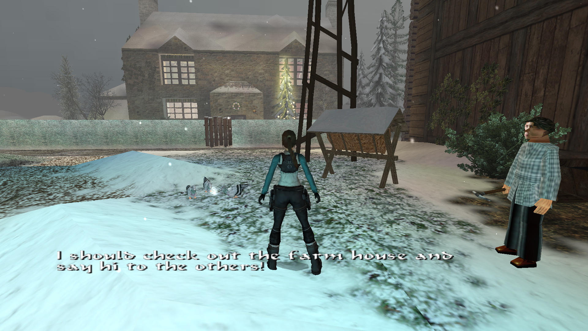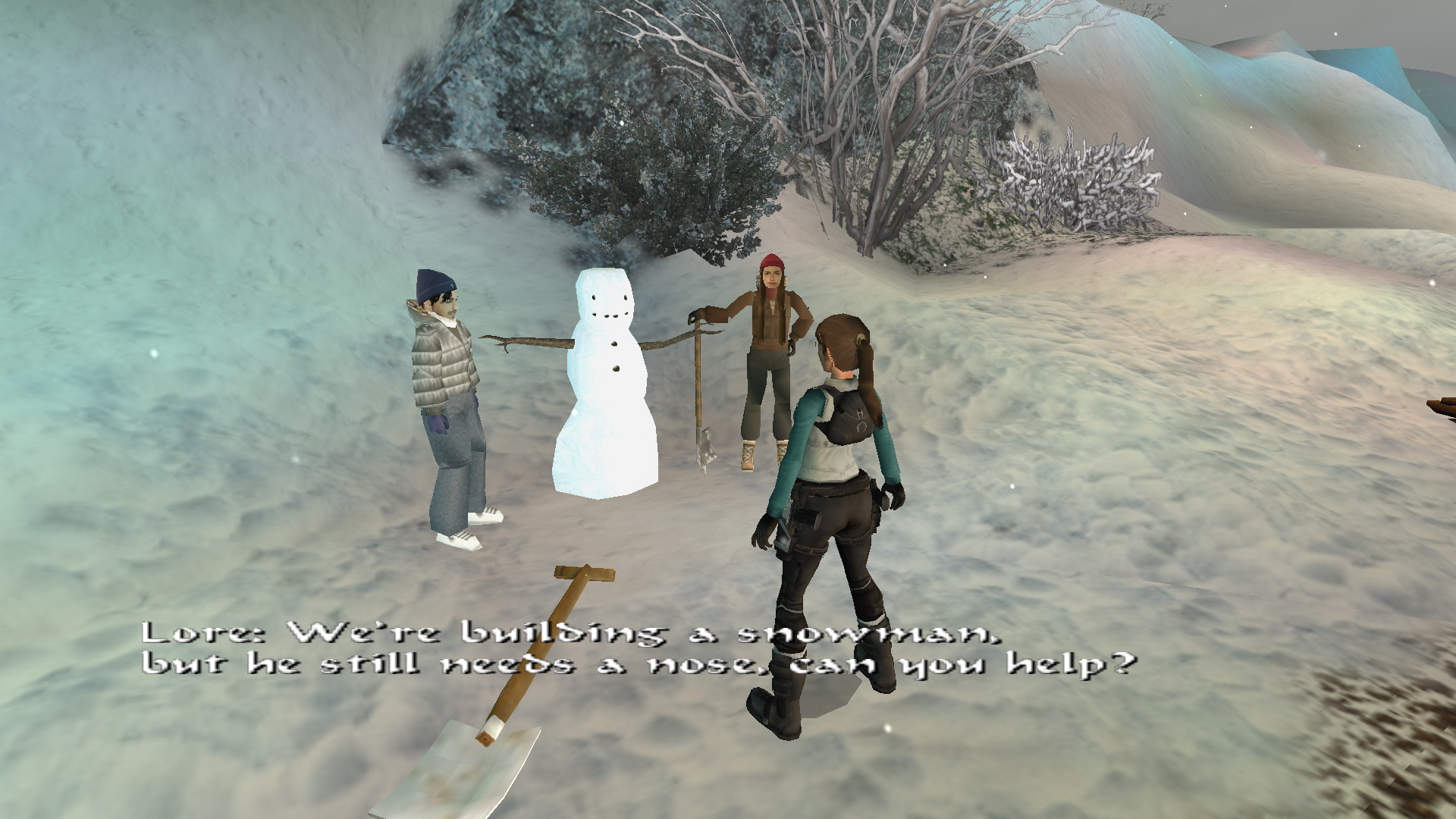 Menj tovább ott, a tanyaház hátsó udvarára. Látod, hogy két ember egy hóember mellett állnak. Közelítsd meg őket, hogy megtudd, hogy ők Lore[Raider és Dinne[raider. Egy rövid beszélgetés után Lara rájön, hogy a hóember, amit építettek, hiányosan van feldíszítve. Picit besegít majd.