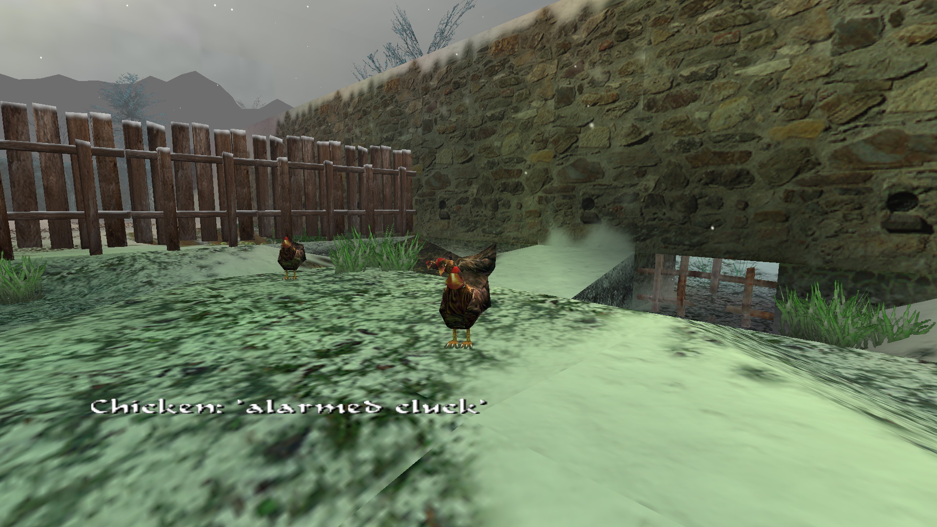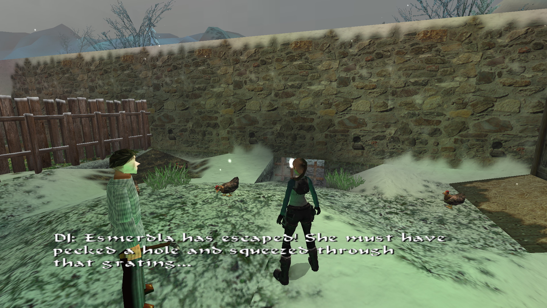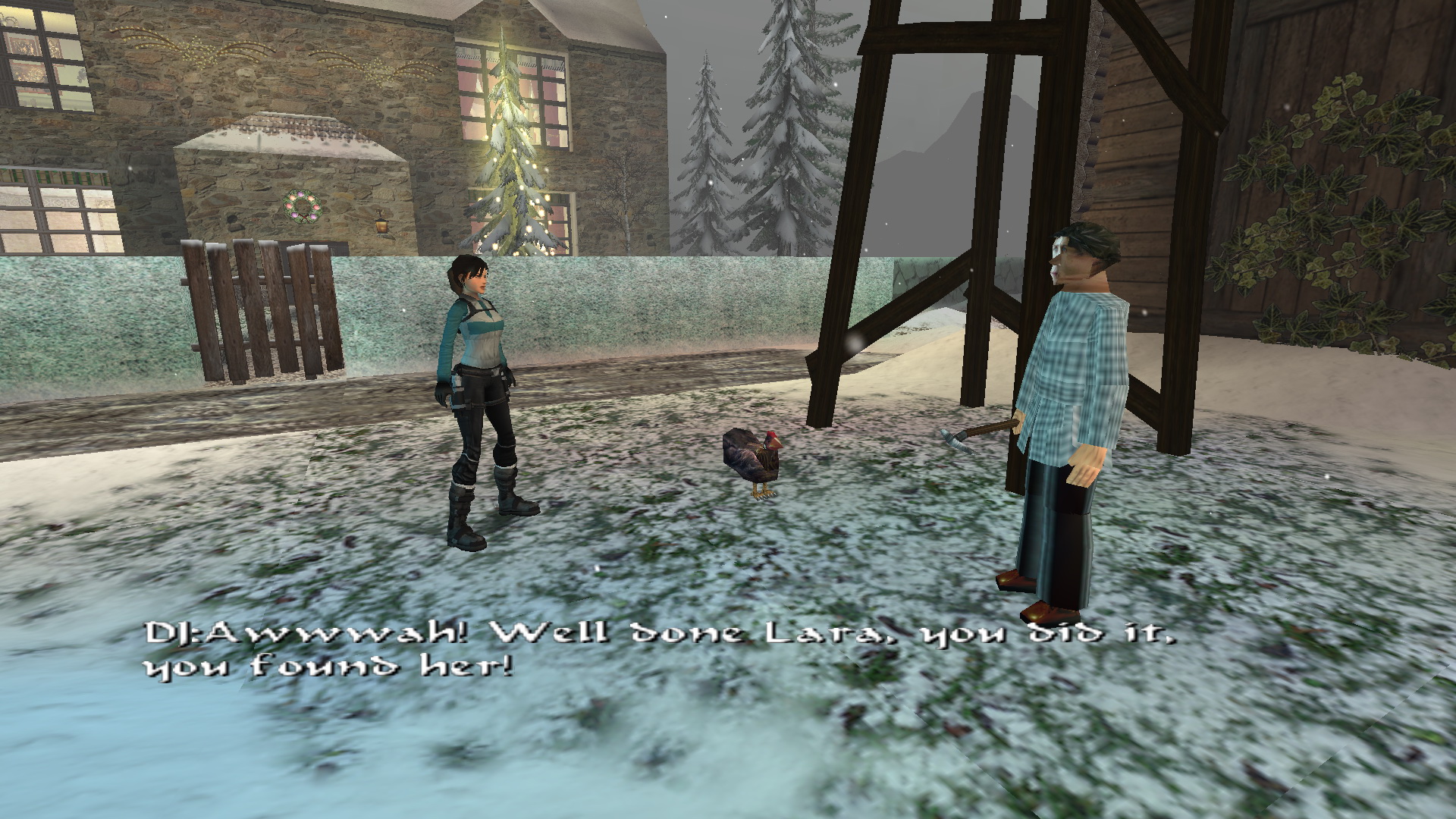 DJ: Lara! Úgy nézel ki, mintha már régóta itt lennél! Most, hogy itt vagy, hasznossá teheted magad, és segíthetsz megetetni a csirkéket. Szükséged lesz egy kis gabonára. A régi malomban találsz majd belőle. A többiek a házban várnak rád, hamarosan elkezdik előkészíteni a karácsonyi vacsorát, úgyhogy abban is segíthetsz. Ne aggódj, Esmeralda, (A csirke) pulykát eszünk... ebben az évben.