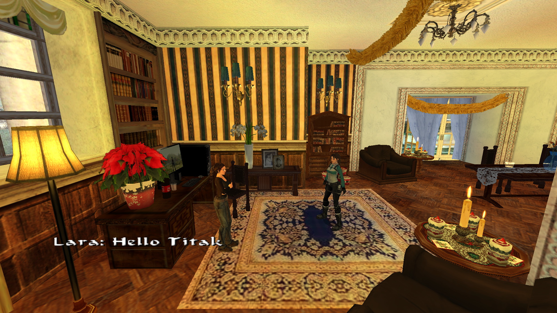 A karácsonyfa mellett találsz fáklyákat az ablak melletti asztalon, majd nyugat felé az étkezőbe menj, ahol egy óra ketyeg. Nézz balra a konyhába, majd kerüld meg az étkezőasztalt, és nyisd ki a bal oldali ajtóablakot, hogy beengedj egy kis hideg levegőt. Ide később még visszatérhetsz, de előbb menj tovább a konyha után a könyvtárba, és kezdj beszélgetést Titakkal (ahol megtudjuk, hogy a nevét tee-tack-nak ejtik, nem pedig tie-tack-nak:)).
