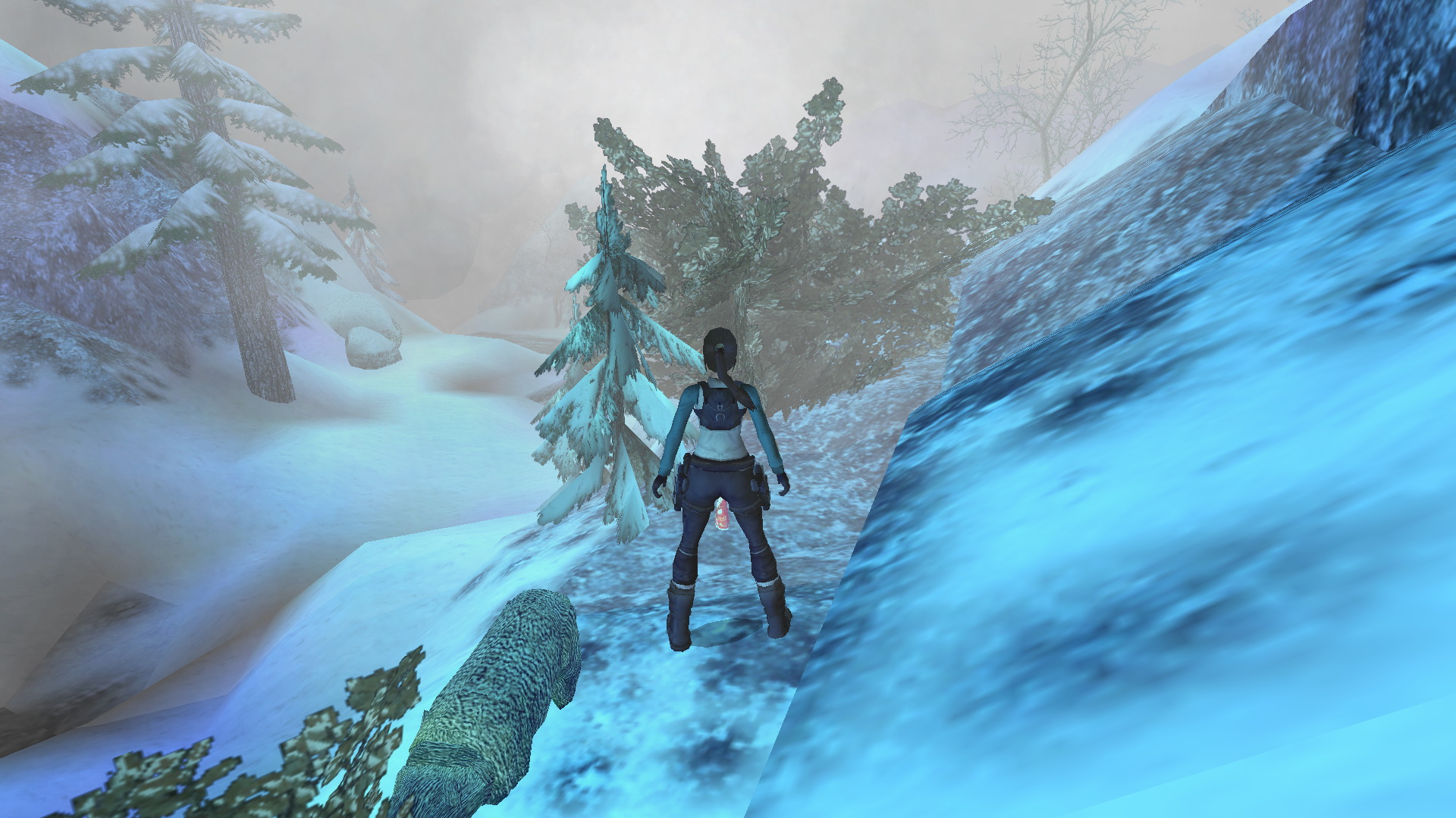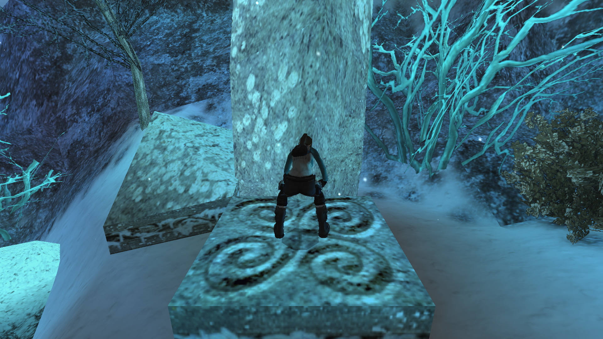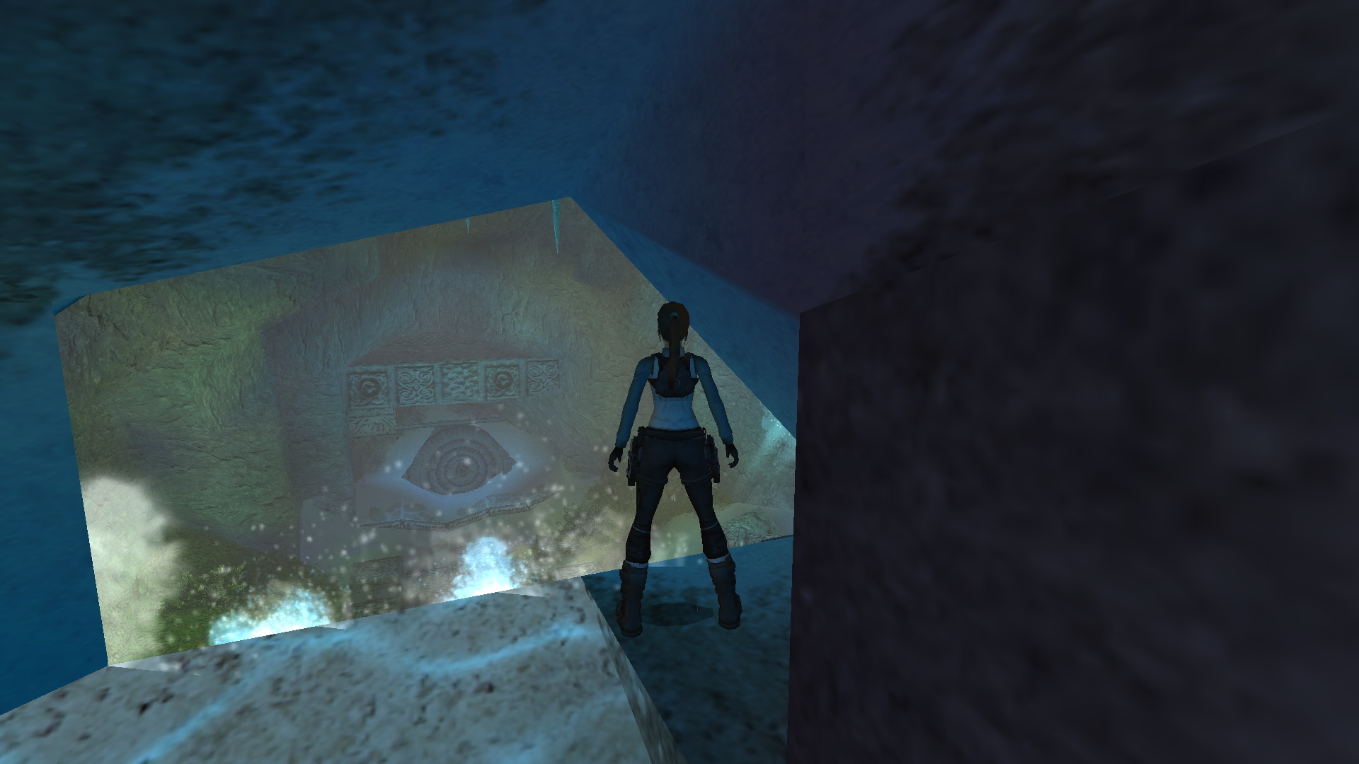 Menj vissza a magasabb kőpárkányra, ahonnan feljutottál ide. Ugorj most a folyó túloldalán levő kék sziklára. Fordulj balra, és ugorj egy futóugrással egy fal melletti párkányra. Ugrálj kapaszkodva a fali beugróba, és nyomd meg a díszes gombot, amely egy ajtót nyit ki, a fagyott felszín alatt. Juss le a befagyott folyóhoz.