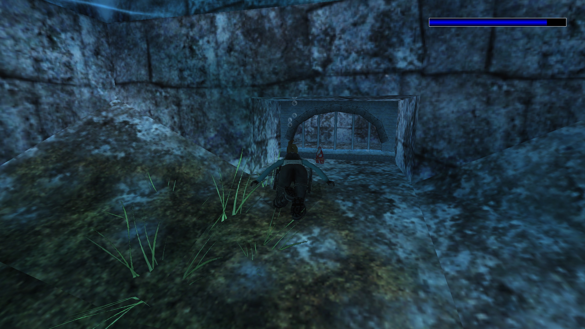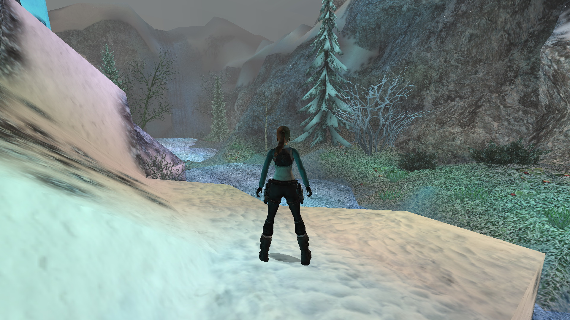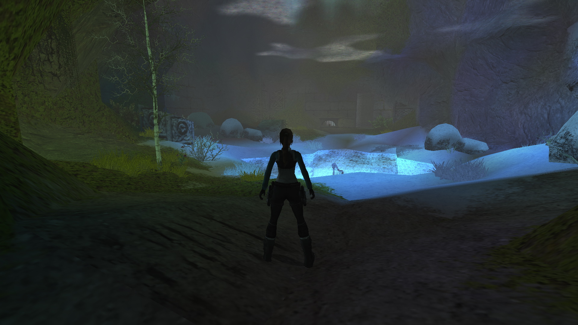 Menj vissza a magasabb kőpárkányra, ahonnan feljutottál ide. Ugorj most a folyó túloldalán levő kék sziklára. Fordulj balra, és ugorj egy futóugrással egy fal melletti párkányra. Ugrálj kapaszkodva a fali beugróba, és nyomd meg a díszes gombot, amely egy ajtót nyit ki, a fagyott felszín alatt. Juss le a befagyott folyóhoz.