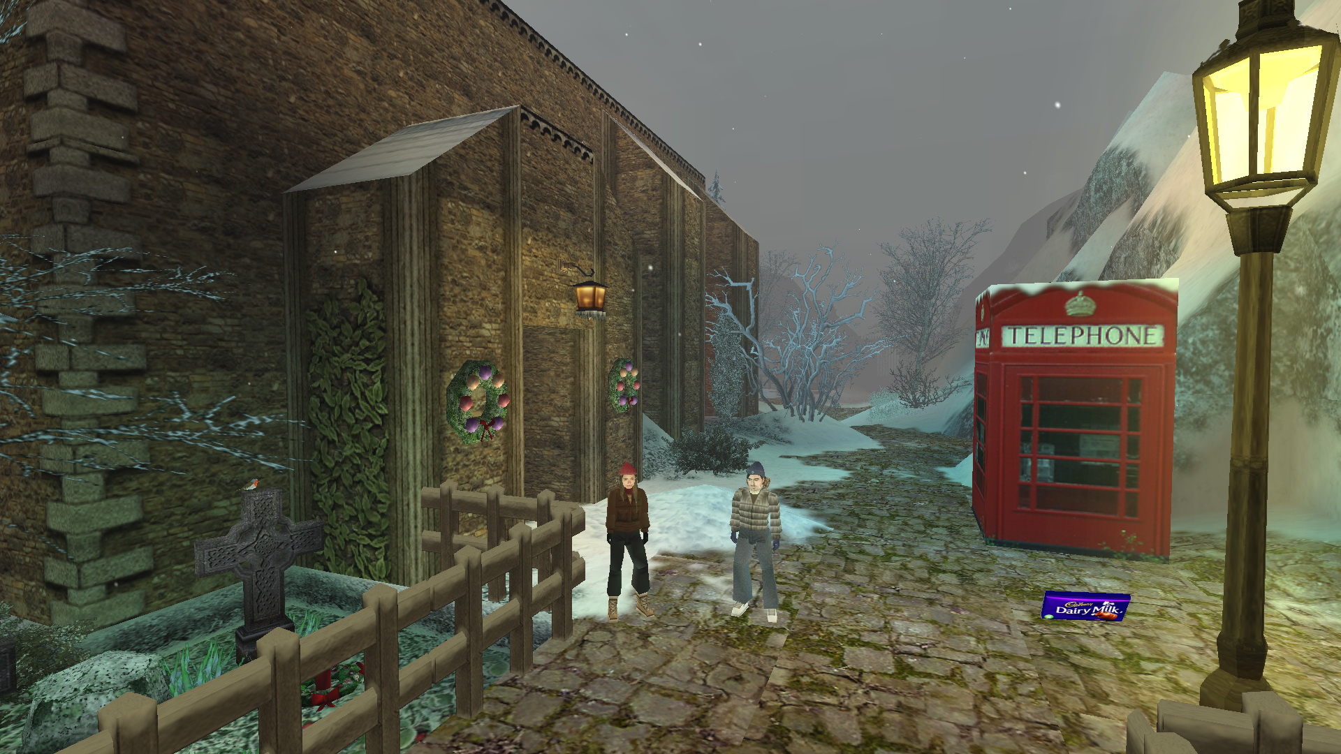 Menj balra, át a kerítésen a tanyaház és egy régi szélmalom között a távolban látható torony felé, majd egy bégető kosnál fordulj jobbra, menj át a hídon, balra fordulva odaérsz egy zárt kapuhoz. Nyisd ki a kulcsoddal, és lépj be a faluba. Fuss át a hídon, és az előtted lévő óriási kereszt mellett balra, tedd be Titak levelét a Mikulásnak a piros postaládába. A postahivatal ajtaja kinyílik, menj be, és fogj néhány fáklyát a gyümölcspultnál, és süteményeket a pult tetején. Állj a pénztárgép elé, add ki a hölgynek a pénzed, és vegyél egy rúd Cadbury’s Daily Milk Csokolád-ét.