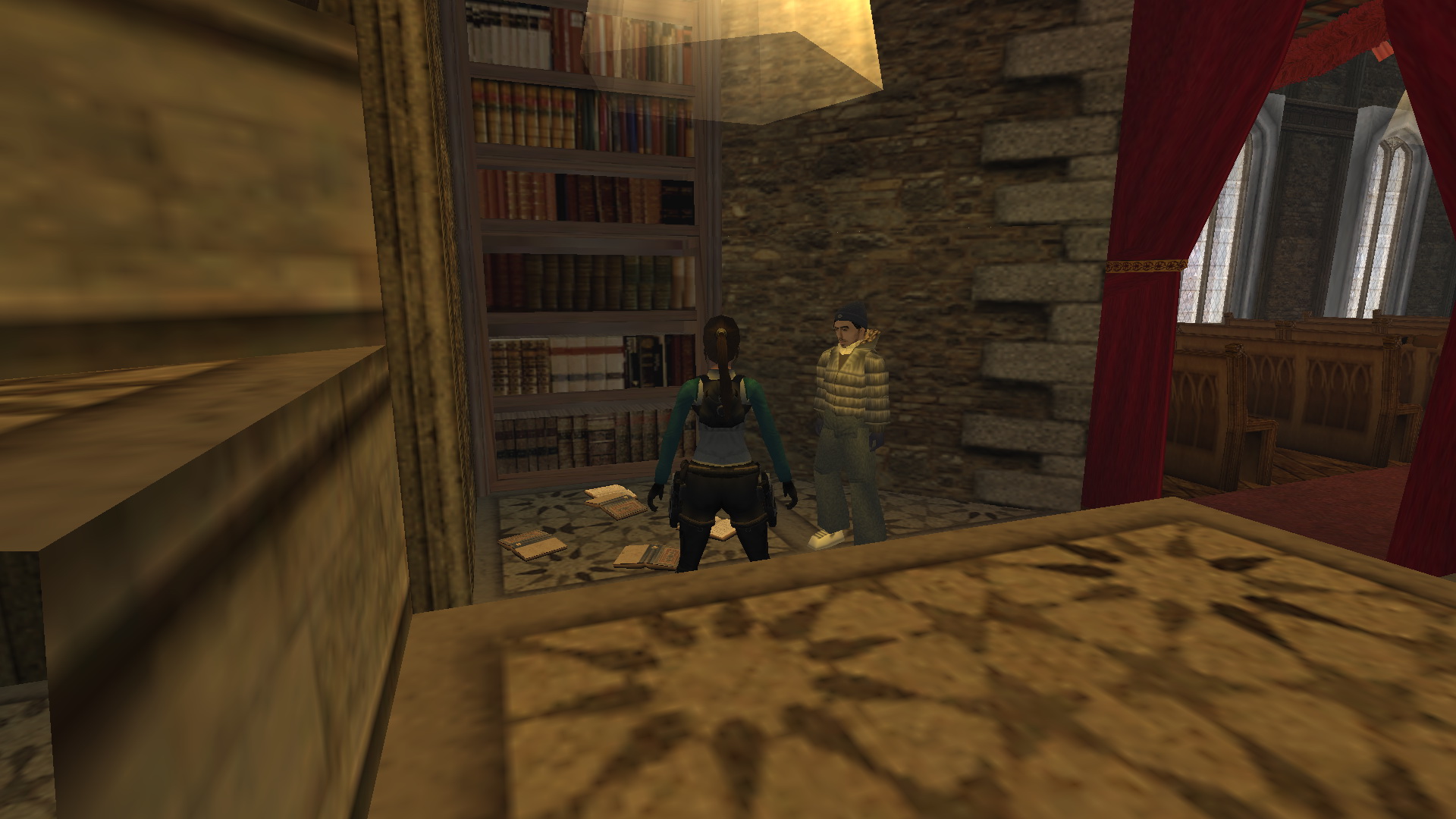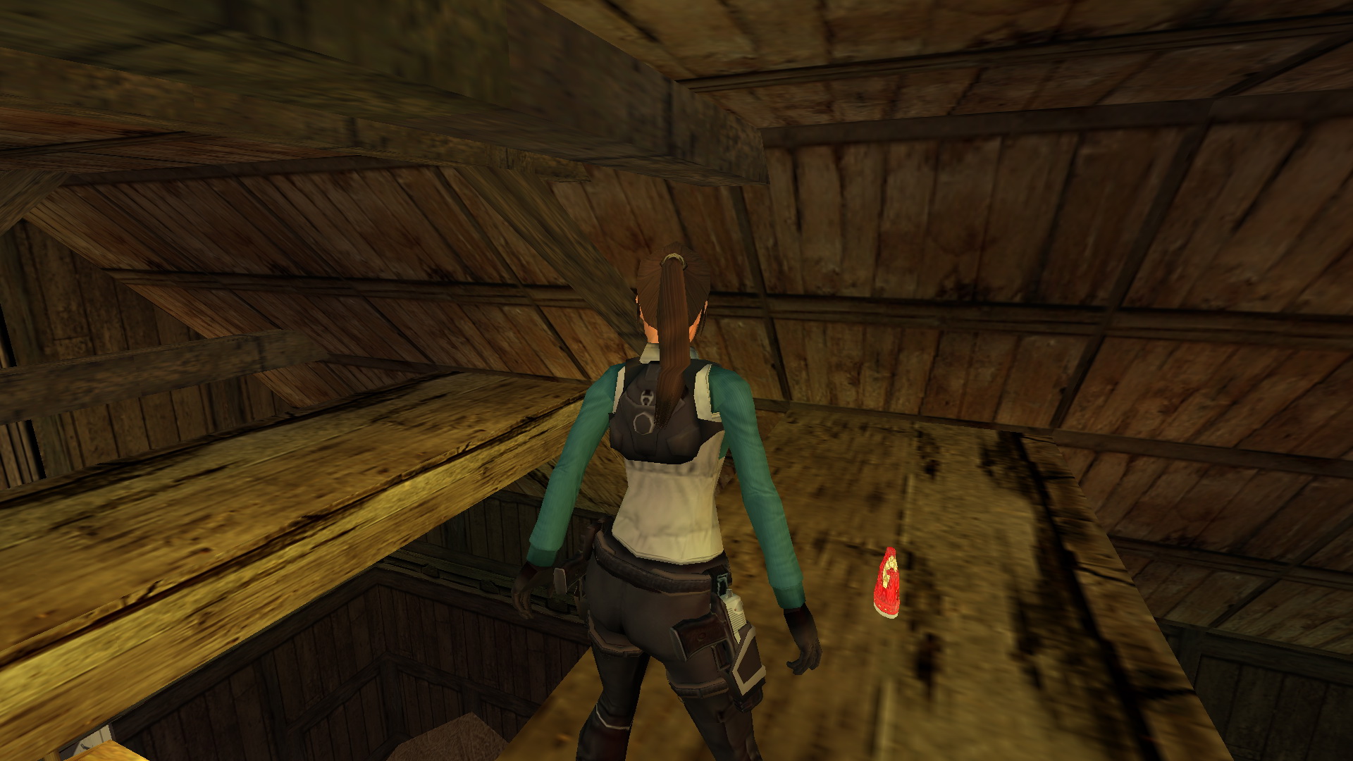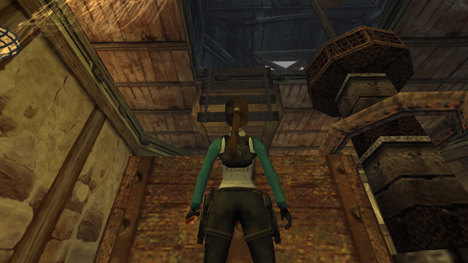 Menj be, hogy megtudd, hogy Floris, a macska csapdába esett odalent a raktárban, így rövid időre más dolgod akad, mielőtt Esmeralda keresésére indulnál. Fordulj balra, és húzd le a fali kapcsolót, hogy kinyíljanak a pajtaajtók. Menj vissza, és keresd meg a létrát balra. Mássz fel a padlásra, és vedd elő a pisztolyaidat először, hogy kilőhesd azokat a kis egymásra rakott ládákat a fáklyákért. Keress a hordók mögött a fal mellett süteményeket. Menj a falhoz, fordulj meg, és ugorj fel, hogy megragadd a gerendát. Mássz fel egy nagy medipackért, ugorj le és menj vissza a ládához, ami közvetlenül szemben van a lógó zsákkal.