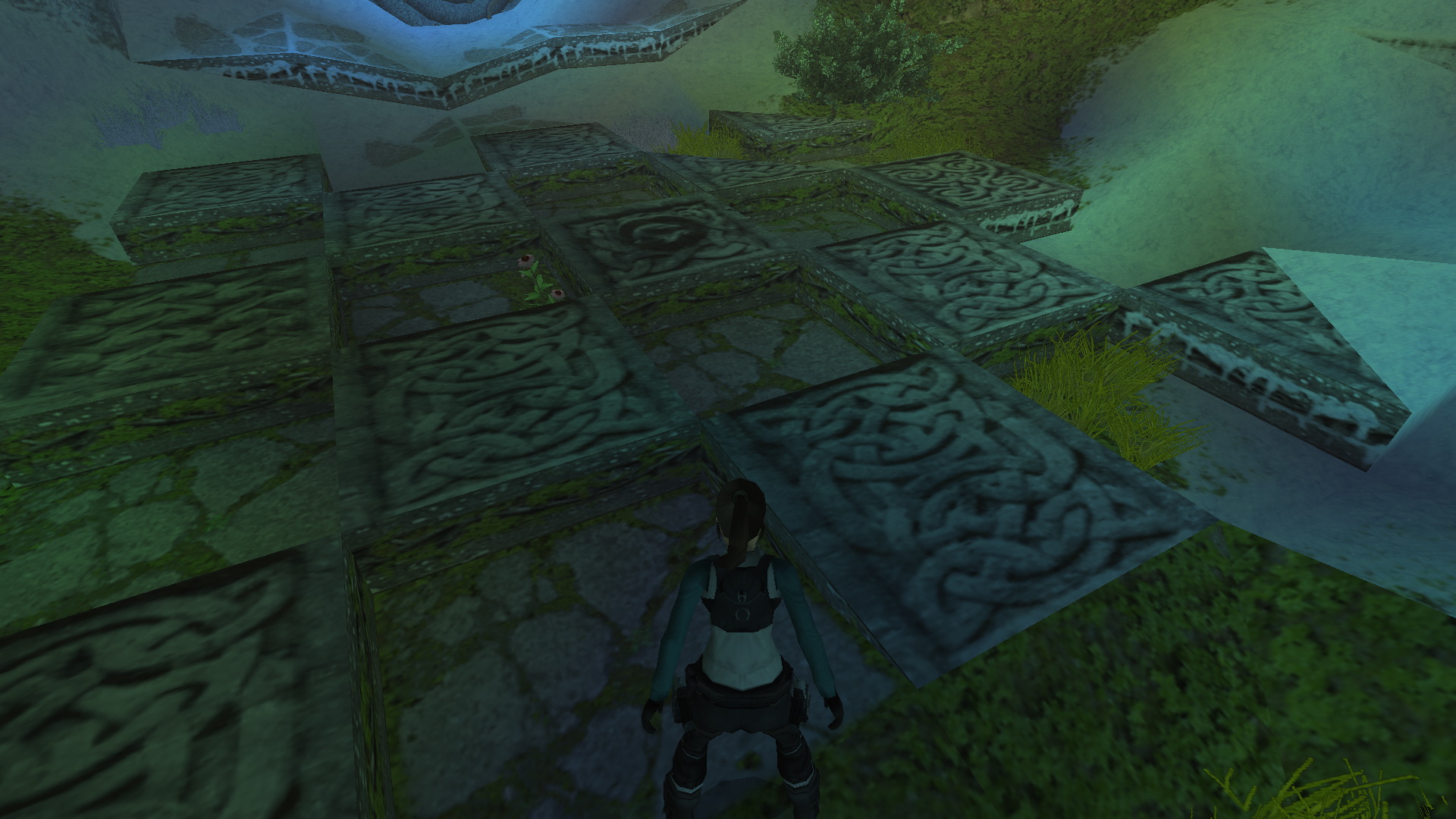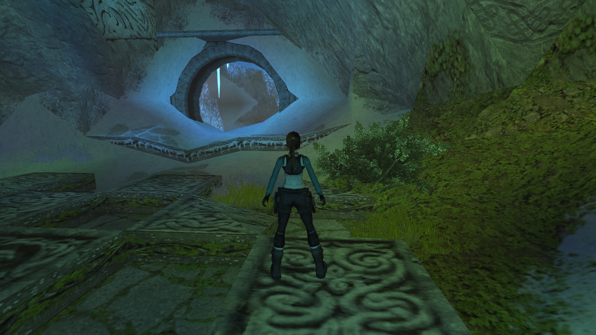 Menj oda, gázolj át a vízesésen, át a folyosón, és bukkanj ki egy nyílásnál, amely egy földalatti területre néz. Hosszú az út lefelé, ezért lógj le a peremről, csimpizz balra, és ereszkedj le egy háromszög alakú párkányra. Juss le a szomszédos tömbre, ugorj három egymást követő ugrással a fokozatosan alacsonyabb tömbökre, és végül zuhanás a barlang padlójára. Fuss balra, és húzd meg a kapcsolót a blokkon. Egy bejátszásban egy csempecsík jelenik meg, amelynek mintái megegyeznek a mögötted lévő padlón lévőkkel. A feladatod az, hogy a megfelelő sorrendben rálépj a megfelelőkre, hogy kinyíljon a kereks ajtó. A kérdéses csempék azok a három, amelyek az ÉNy-D-i irányban futó középső csíkot alkotják. Mielőtt elindulsz, mentsd el a játékot, ha esetleg elrontanád.