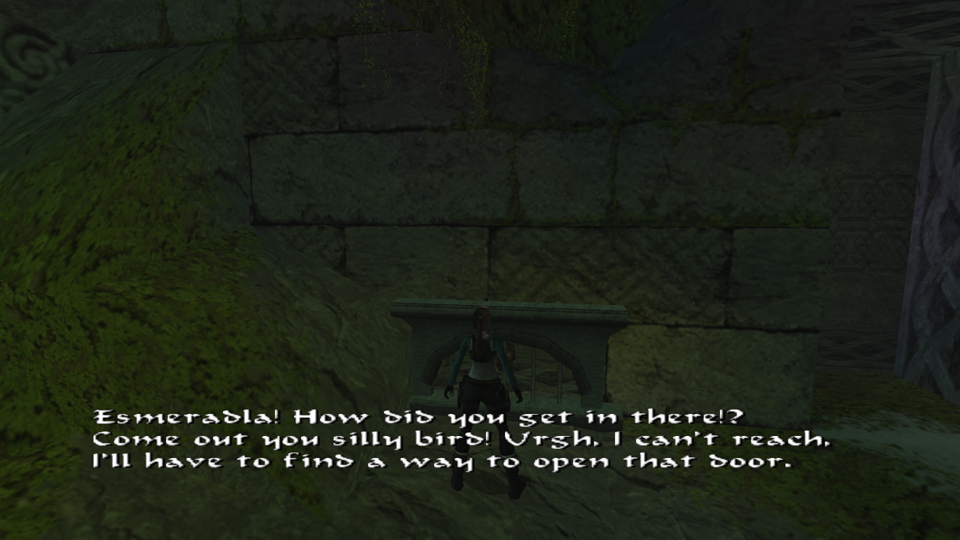 Vedd Esmeraldát a karjaidba, és hagyd el ezt a területet, menj fel a rámpás alagúton vissza a barlangba, ahol a padlócsempe rejtély volt. balra menj a fali beugróhoz, és letéve a sirkét, húzd meg a fali kart.
