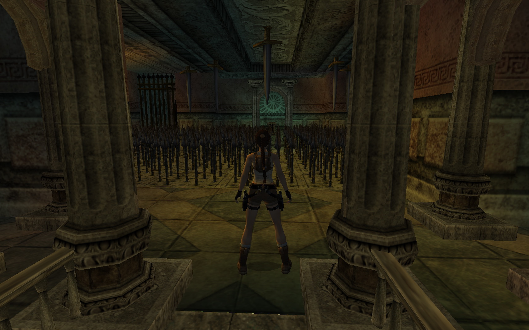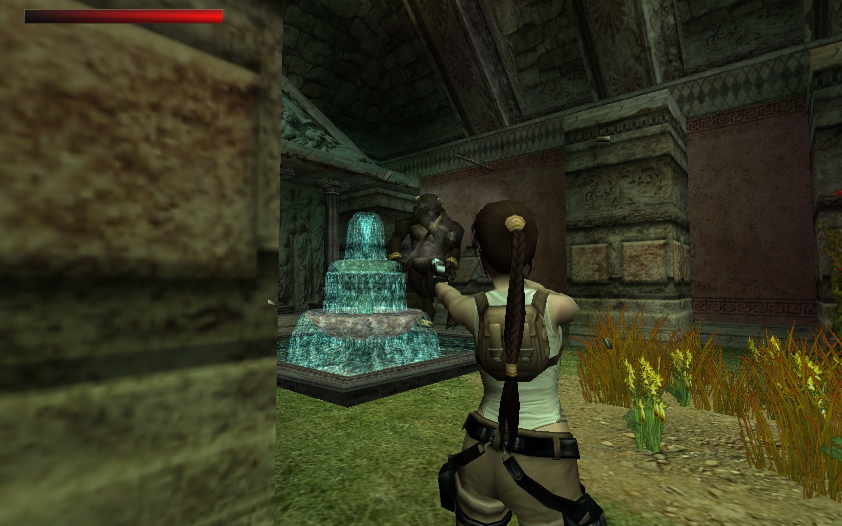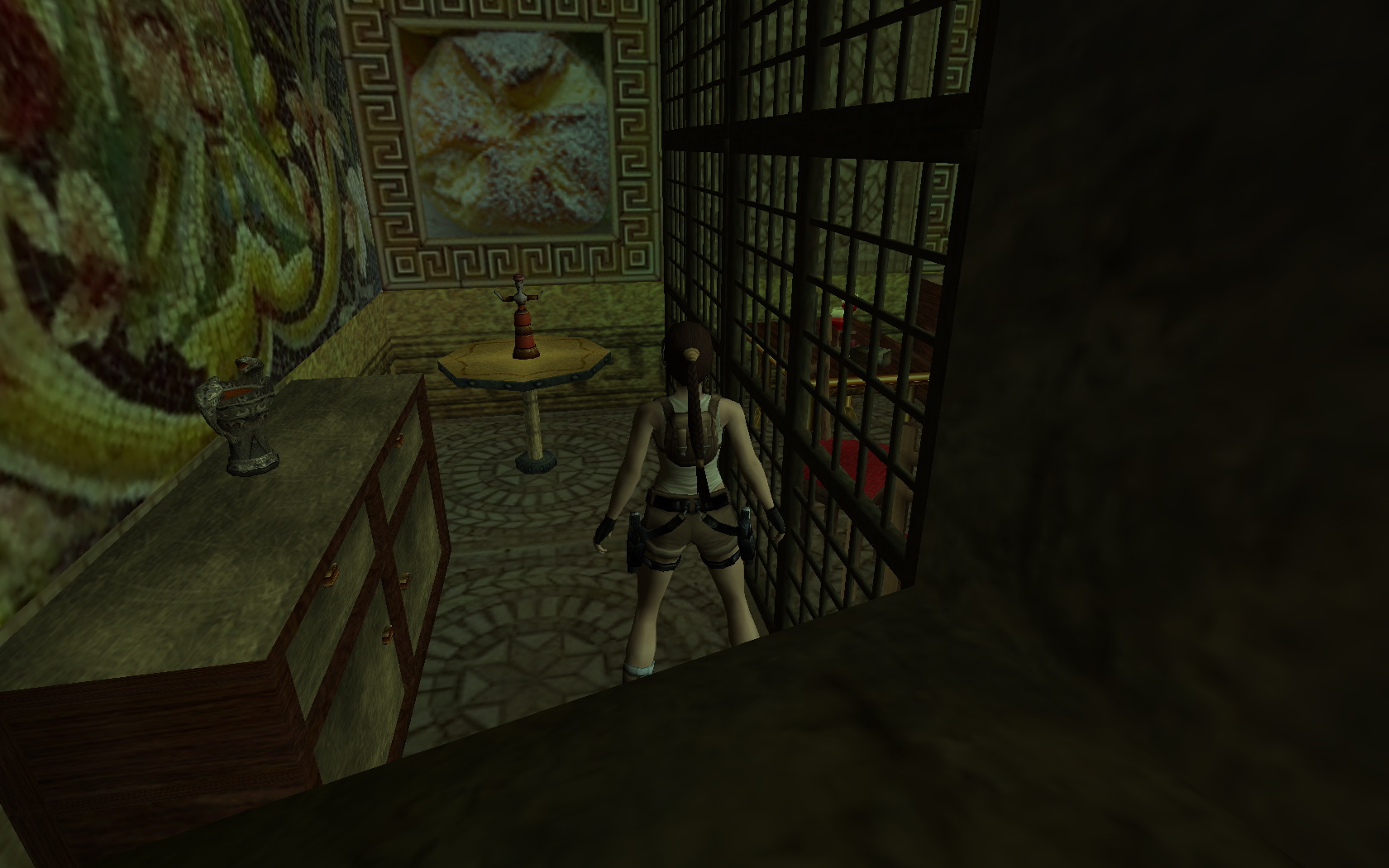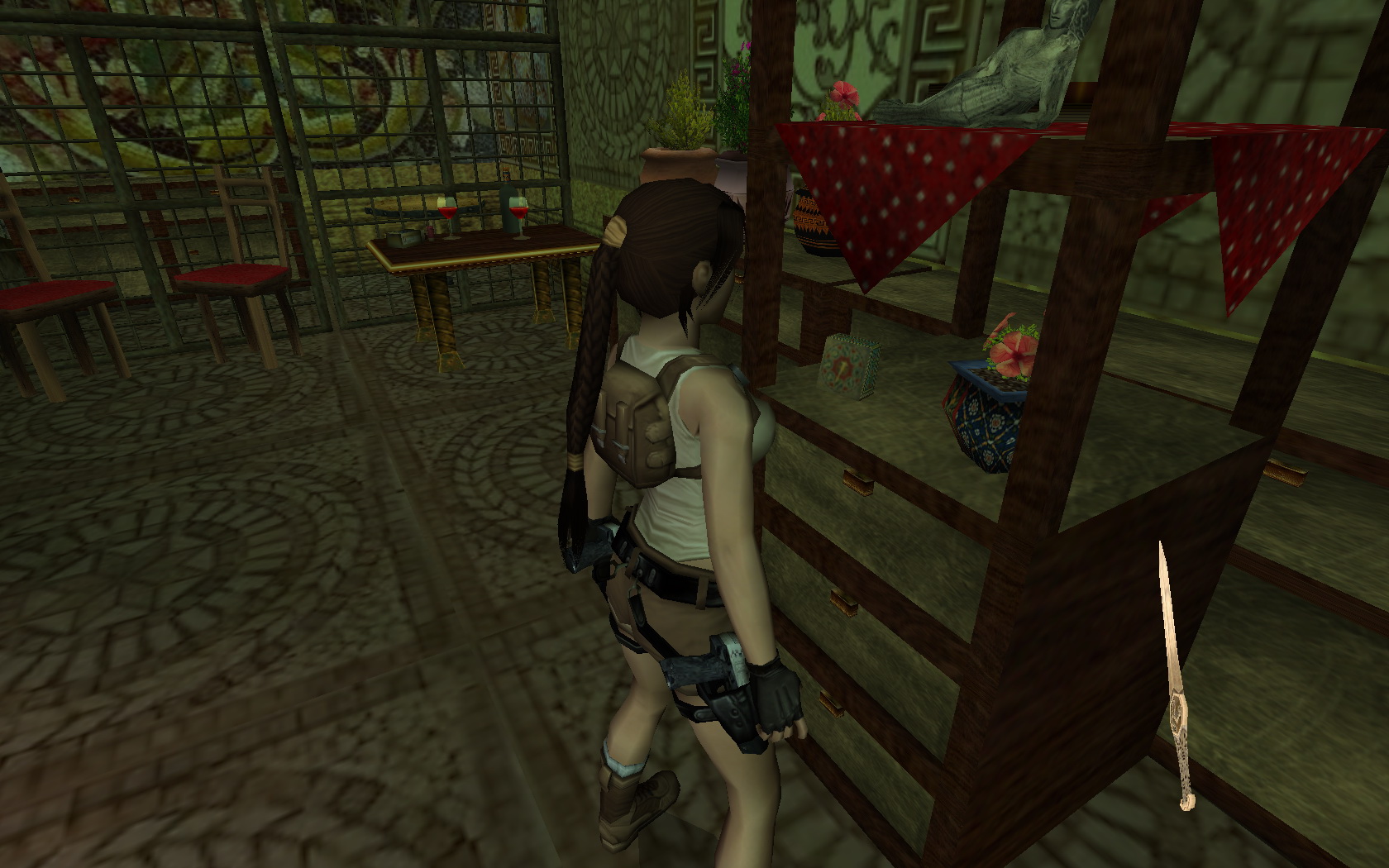 Menj ki a medencéhez, és a túlsó sarkánál nyisd ki az ajtót. Lődd le a patkányokat, tépd fel a csapóajtót, menj le. A folyosón balra rúgd át a falat, bent jobbra, a hordó előtt lőszert találsz, a másik oldalon pedig szétlőve az akadályt, egy fali gombot kell benyomnod. Menj ki, de mielőtt a medencéhez érnél, az ajtón innen, nézz felfelé. Mássz fel az indákon, majd jobbra juss el az épületre. Onnan menj, ugord át a kis kerítést. Kutasd ki a kriptát, medipack-ot rejt, fáklyát is találsz ott, lődd le a madarat, majd kússz át a résen. Nyisd ki az ajtót, vedd fel a medipackot az asztalról, nyisd ki a következő ajtót, menj le a lépcsőkön, rúgd be a faajtót, és a szabadba érsz. Balra menj, a következő teremben nyomd meg a fali gombot, és irány vissza az előző terem, át a kinyílt ajtón. Lőszert, fáklyát találsz ott, és a szekrényen egy Perszeusz Kardját, ami a feszítővas a játékban.