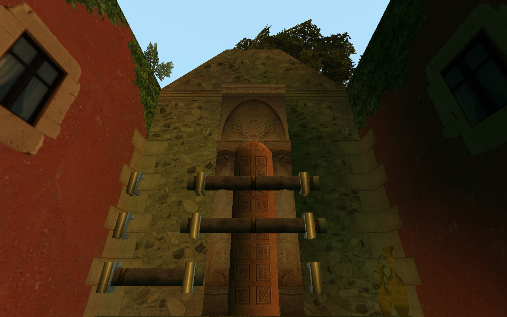 Menj le a térre, menj ismét a piacre, de most jobbra menj. Jobbra a beugróban a láda medipackot rejt, majd bemenve az oszlopcsarnokba, az asztalt told jobbra a fali réshez. Állj fel az asztalra, sétálj ki a végébe, és egy helyből ugrással elkapod a rést. Mássz fel, ott nagymedipackot találhatsz a ládában, előtte pár patkányra vadászhatsz. Menj le a lépcsőn, nyisd ki az ajtót, balra látod a három gerenda által zárt ajtót. Menj tovább egyenesen, majd a túloldalon jobbra, meg is van az első, meghúzható kapcsoló, ami nyitja z első gerendát. Megfordulva menj bara, az asztalra állva feljutsz az emeletre, a folyosó végén mássz le az indákon, és meghúzhatod a második kapcsolót is. Menj fel a lépcsőn, nyisd ki az ajtót, a szobából is menj ki, és a kis téren meg is van a harmadik kapcsoló. Menj le a lépcsőn, be balra az oszlopcsarnokba, az asztalon át juss ismét fel, majd le a lépcsőn, ki a szabadba, és át a most már nyitott ajtón.