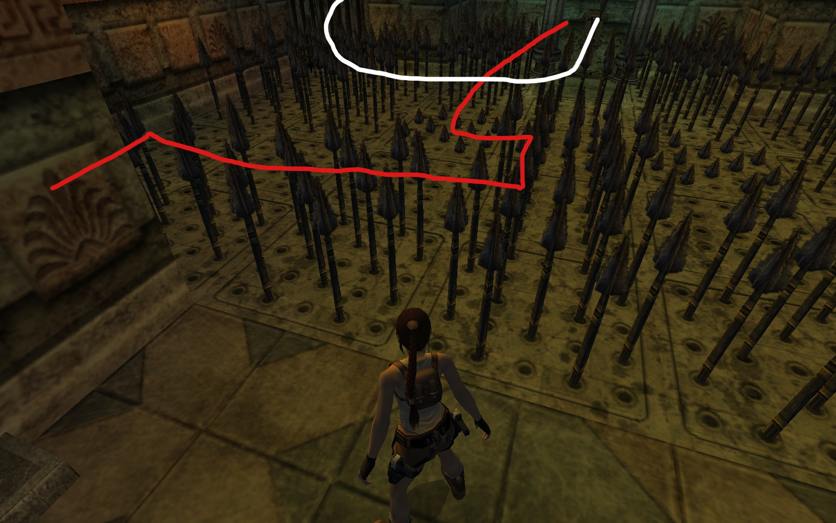 IV: Balra indulj el, és a fal mellől figyeld a tüskéket, amikor visszahúzódnak, indulj el, nem kell rohanva, de néha megállva. Újabb tüske húzódik vissza, majd balra kell menned, utána jobbra és elérsz a fali karig. Húzd meg, fordulja balra, és közvetlenül a fal mellett rohanj át be jobbra a másik kis terembe, amikor visszahúzódnak a tüskék. Ott is húzd meg a kart. Most már simán átmehetsz a túloldali beugróba, ahol az emelvényen nagymedipackot kapsz. Menj vissza a három karos terembe.