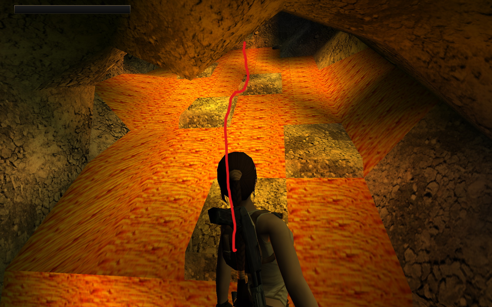 Beleesel a vízbe. Ússz le, át az átjárón, majd balra be a sziklalyukon át. Vigyázz a pengékre, majd felúszva, a teremben, szembe állva az oszlopon két oldalt levő fényes gombokkal, fel-felugorva lődd szét őket. Mássz fel a falból kijött tömbre, ugrás a szemközti platformra, majd jobbra a rúdon át juss el a másikra. Most ments egyet, majd a platform végéről, helyből ugrás a kinyúló platformra, futás, ugrás jobbra a szemközti beugróba, és szedd ki a szoborból a Red Garnet-et.